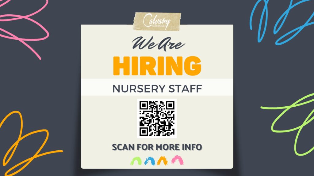 Calvary Tabernacle is growing, and with that growth, we’ve had to expand our nursery ministry—sometimes opening up to three nursery rooms at a time! We are currently hiring multiple nursery staff positions and are looking for caring, dependable individuals who love working with children.